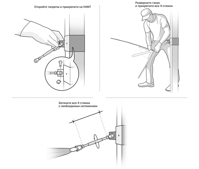 Гамак растянуть на четыре стороны куба, после чего закрепите талрепу через карабин к элементу HANT. Затем по очереди каждую сторону гамака зацепите за талрепу. Убедитесь что гамак установлен ровно по центру, после чего поочередно крест накрест затяните каждую талрепу.